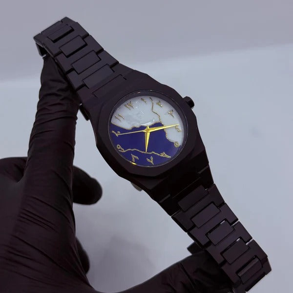 The Black Arabic Aura Blue Mabel Dial wristwatch combines a sophisticated black fabric strap with a striking blue Mabel dial, featuring clear Arabic numerals for easy readability. Designed for both comfort and style, its fabric material ensures durability and breathability, making it suitable for extended wear. This watch balances a classic look with modern elegance, perfect for those seeking a refined accessory that complements both casual and formal attire.