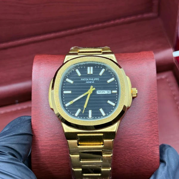 Experience timeless elegance with this Patek Philippe gold watch featuring a striking black dial. Meticulously crafted, it combines luxurious gold with a minimalist, sophisticated design, ensuring exceptional legibility and style. Perfect for collectors and connoisseurs, this timepiece exemplifies impeccable craftsmanship and enduring prestige.