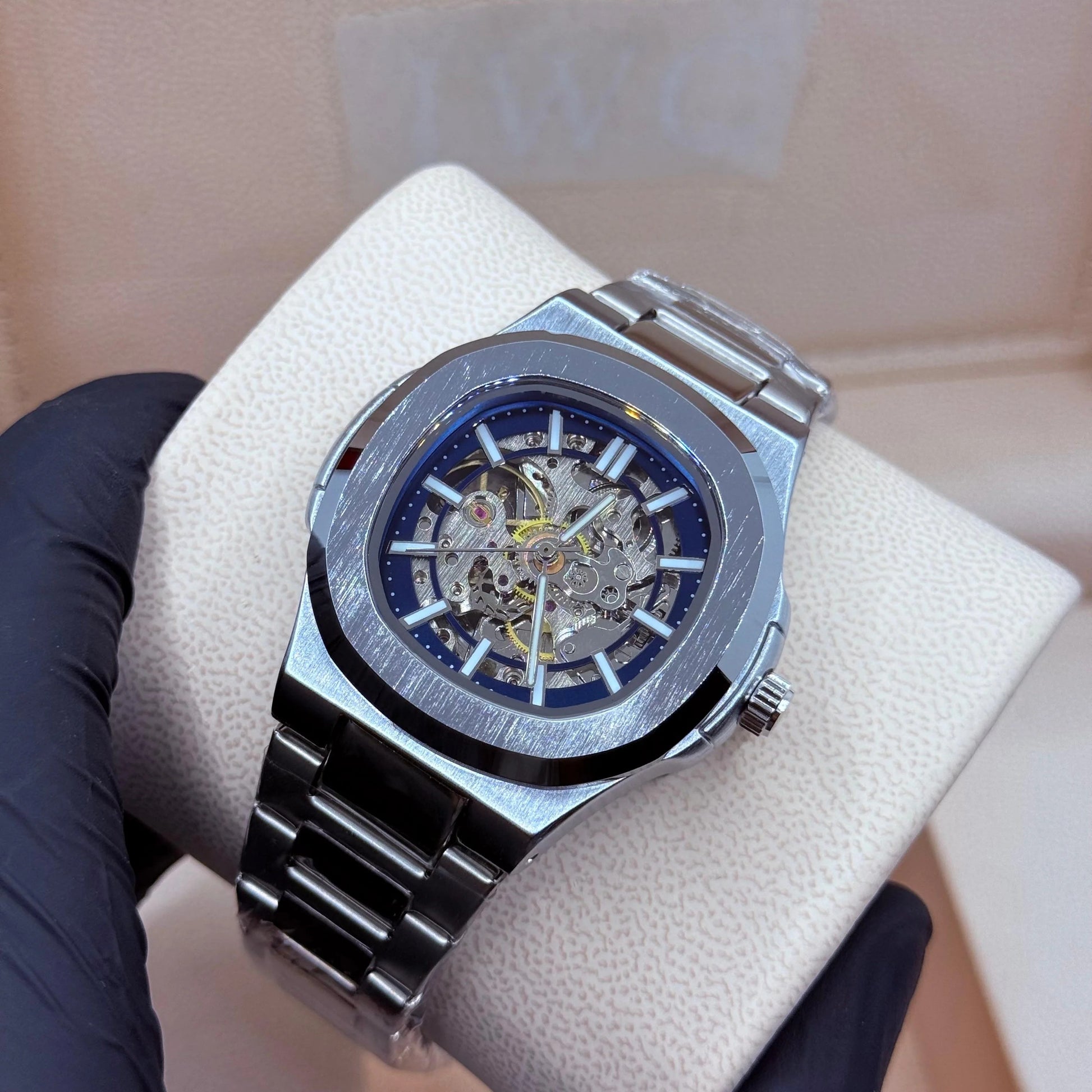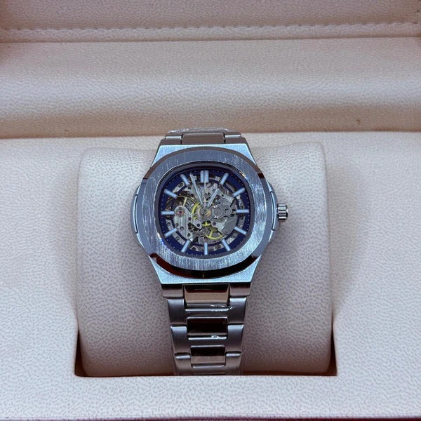 This PP style automatic watch features a sleek silver case complemented by a striking blue skeleton dial. Its automatic movement ensures precise timekeeping without the need for batteries, while the transparent design offers a detailed view of its intricate inner workings. Combining technical sophistication with modern aesthetics, this timepiece is ideal for enthusiasts seeking both functionality and style.